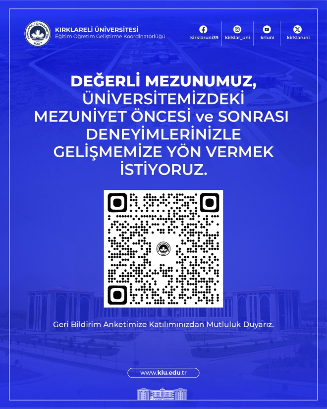 Kırklareli Üniversitesi olarak, kapsayıcı ve sürdürülebilir nitelikli eğitim hedeflerimiz doğrultusunda en önemli paydaşlarımızdan biri olan sizlerin deneyimlerini ve görüşlerini önemsiyoruz.